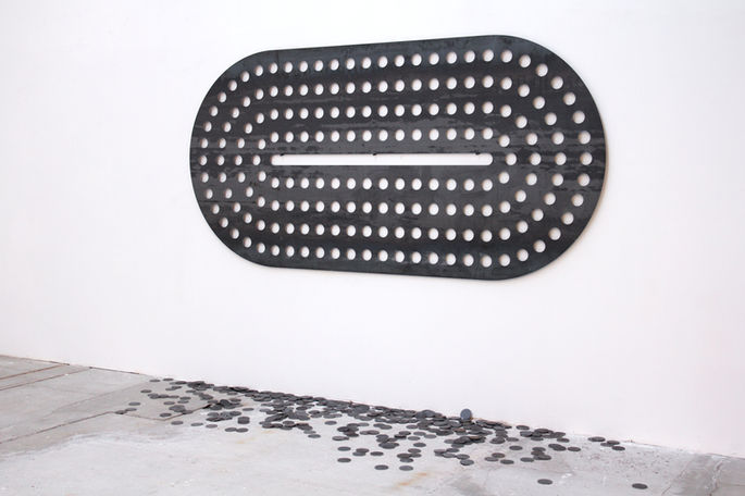 Mue, acier perforé et chutes, 140 x 290 x 0,4 cm, 2026.