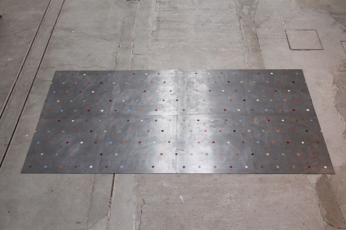 Seuil se compose de huit tôles d’acier disposées en pavement et gravées d’une trame. Des cercles de couleurs sont peints à la surface selon un rythme régulier. Installée à l’entrée de l’exposition elle invite à une pause et un éveil de la perception dans un doute entre sculpture, peinture et architecture.