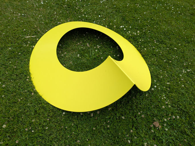 Anneau, donne à percevoir l'énergie qui circule et donne forme à un disque de métal sur lequel on a apposé une profonde pliure. Ce geste élémentaire de sculpture que constitue le pli est employé ici pour faire émerger une forme et un mouvement dynamique à partir du plan et rompre avec l'harmonie du cercle